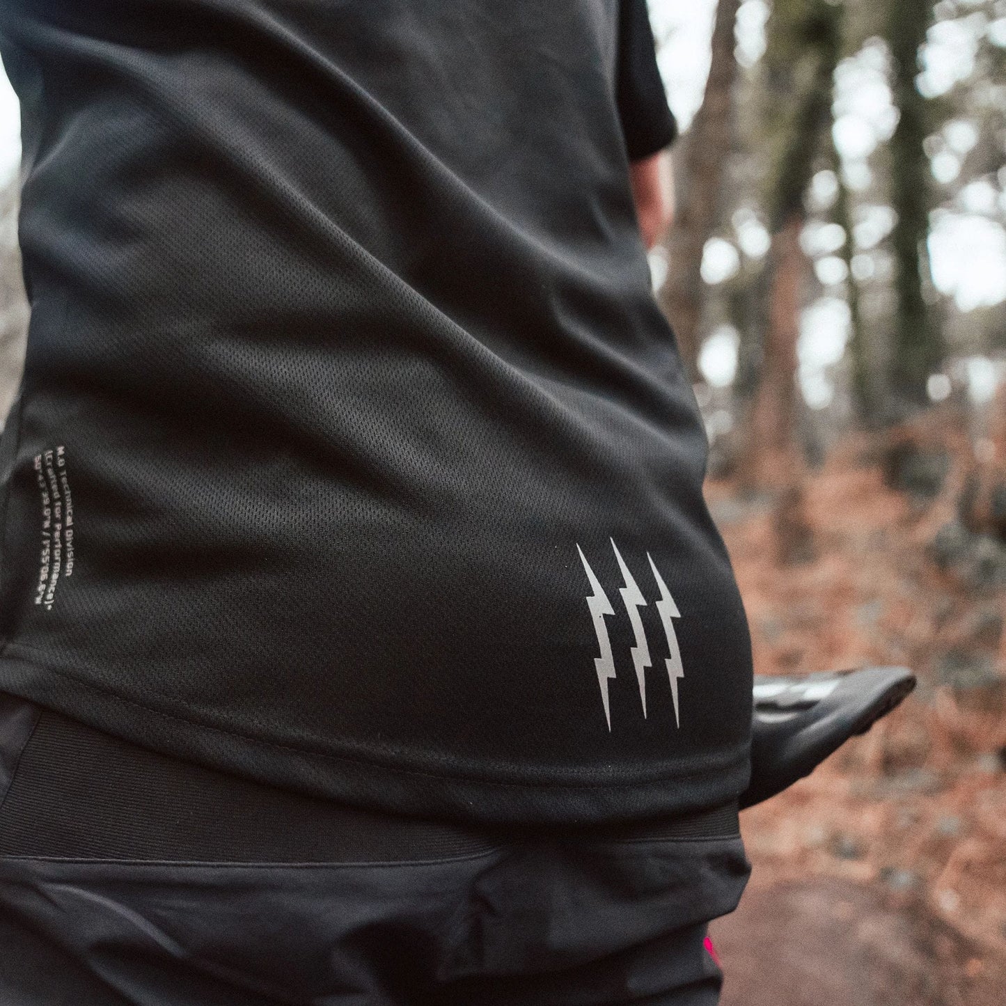 This black short sleeve jersey is constructed from proprietary, breathable mesh fabric with moisture-wicking abilities to keep you cool, dry, and comfortable. Our fabric was engineered to have just the right amount of stretch to keep things loose, but also in place. It features an ergonomic dropped tail too, ensuring the perfect on-bike fit.